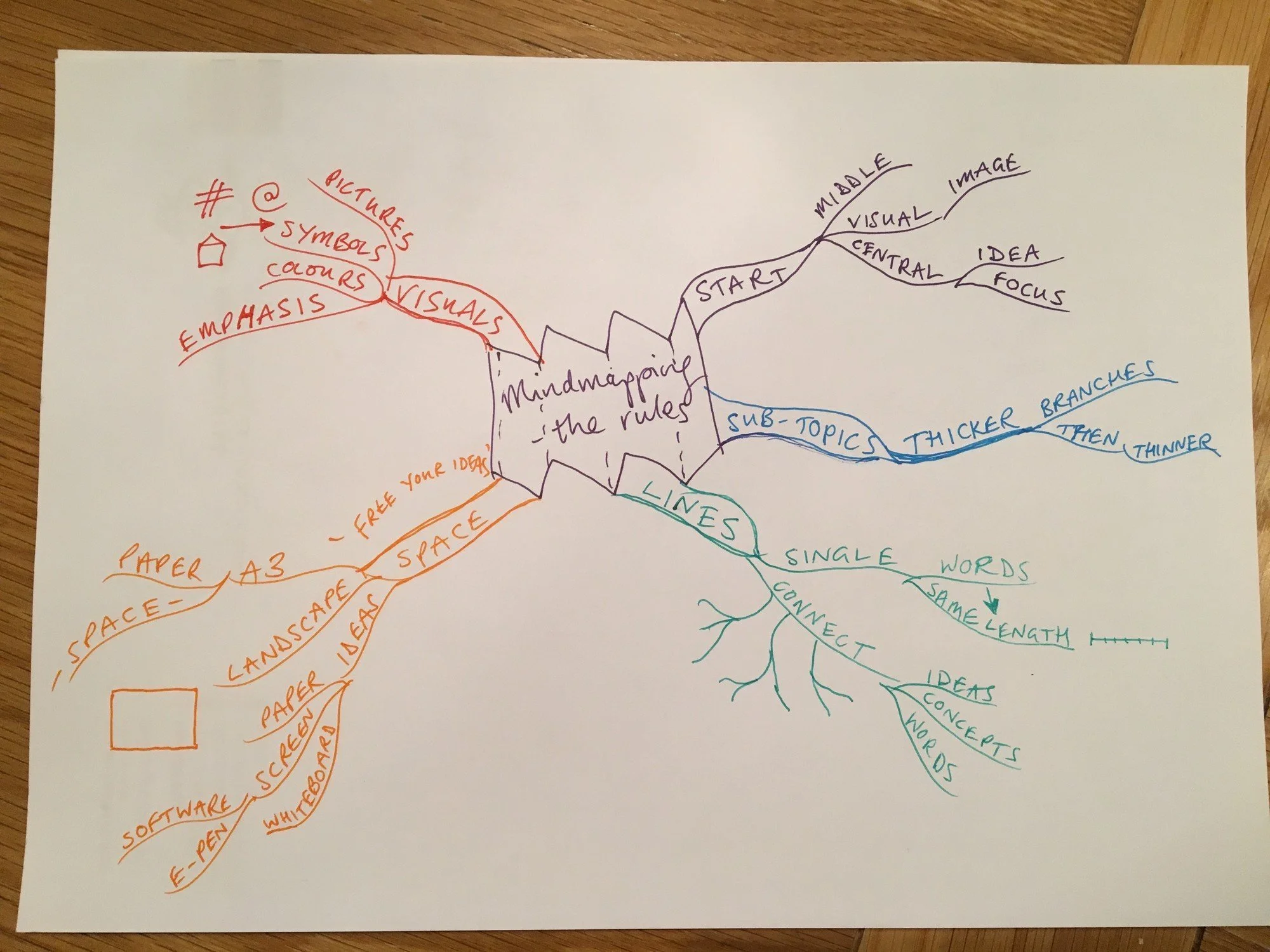 A quick search for mind map rules will give you a more complete guide. Practically-speaking, when using mind maps as an everyday thinking tool without a suite of coloured pens and a stack of pristine A3 paper to hand, here’s what I come back to again and again: